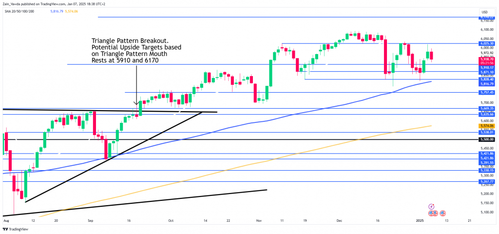 A break of this key support level could pave the way for a deeper retracement toward the 5700 swing low from October 31, 2024.