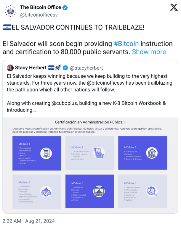 The training, called Certification in Public Administration 1, lasts 160 hours and is done online. It’s divided into seven parts, each covering different concepts, laws, skills, and management for using Bitcoin as legal money.