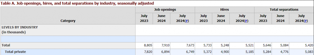 The number of job openings in the US fell by 237,000 in July 2024 from a downwardly revised 7.910 million in June, reaching the lowest level since January 2021 and below market forecasts of 8.10 million.