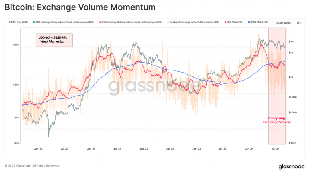 Looking at on-chain data analysis from Glassnode, investor engagement with exchanges is decreasing, as shrinking trading volumes indicate a reduced interest in both investing and trading activities.
