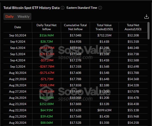Bitcoin prices have recovered last week’s losses as ETF flows snap an 8 day streak of outflows. On September 10, there was a substantial increase in inflows, reaching $116.96 million, which is more than four times the $37.29 million recorded the day before.