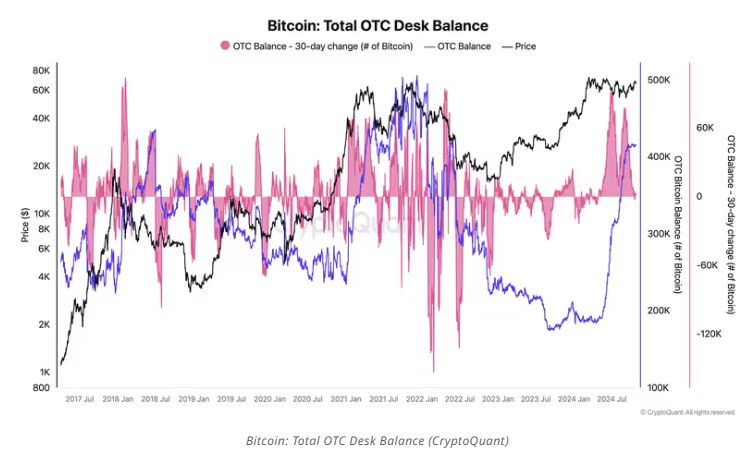 A notable aspect of the recent rise in bitcoin is that OTC desks, where two parties can trade directly and privately, now have 416,000 BTC (worth $30 billion). This is much higher than the average of less than 200,000 BTC they held during the first quarter, based on CryptoQuant data.