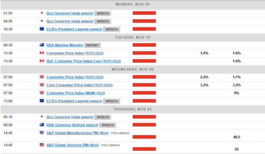 The surprise may come on Monday however, per a Reuters report BoJ Governor Ueda will deliver a speech and hold a news conference in Nagoya on Monday, the BOJ said, an event (which wasn’t previously scheduled) that will be closely watched by markets for hints on whether it might raise interest rates next month. The comments by Ueda could spark volatility in Yen pairs following a bout of weakness in recent weeks.