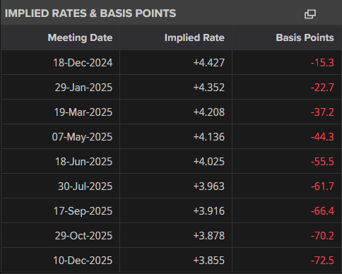 At the start of October, household energy bills went up by about 10%, which means overall inflation might go above 2% again. However, the Bank of England is more concerned with inflation in services which could rise toward 5% once more. ‘Core Services’ inflation is expected to drop significantly from 4.8% to 4.3%. This small detail probably won’t lead to a rate cut in December, but it suggests that the BoE might cut rates more sharply than the 2-3 cuts currently expected over the next few years.